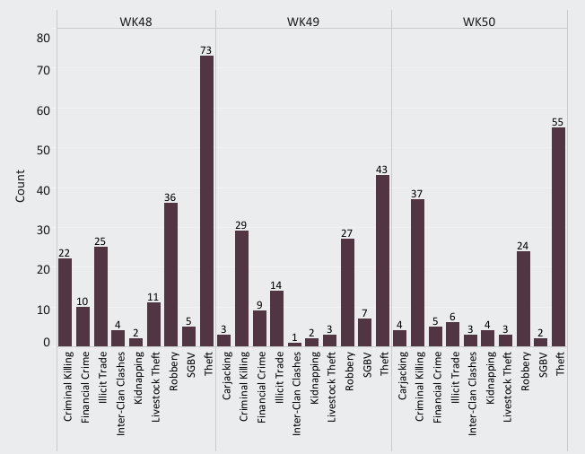 Assessment A significant rise in fatal road traffic accidents (RTAs) is highly likely during the festive season, coinciding with increased traffic on major highways as people travel to reunite with family, attend social and church events, or visit popular tourist destinations. The National Transport and Safety Authority (NTSA) attributes this surge to factors such as drink-driving, driver fatigue, poor visibility, high traffic volumes, and unsafe pedestrian crossings. From January to mid-November, 4,195 deaths have been reported, rising further to over 4,400 by December in some reports. The risk of armed robberies, muggings, and petty crimes remains elevated, particularly during social gatherings. With many residents and employees leaving major cities for extended holidays, an increase in break-ins, home invasions, and theft targeting vacant residential and commercial properties is anticipated. Data from the Castor Vali database shows that incidents of robbery and theft have risen nationwide over the past two months, with theft consistently being the most reported crime. This upward trend, which began in mid-October, has continued into December and mirrors a similar pattern observed last year.