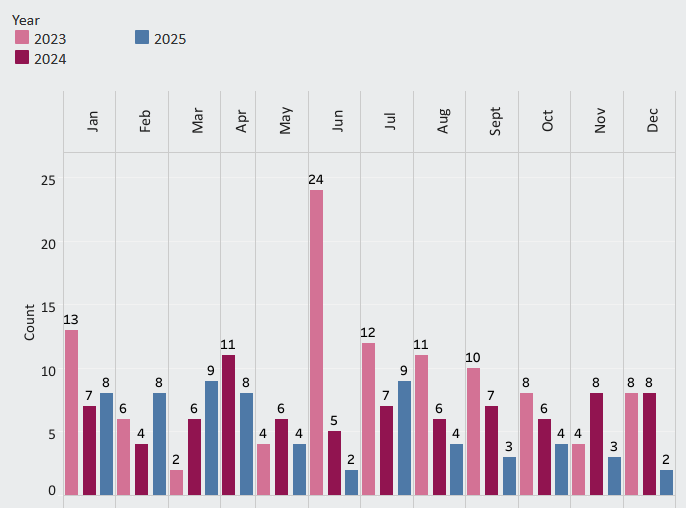 - Increase in robberies and thefts: Robbery and theft incidents rose by 12% compared with the previous reporting period, driven primarily by an increase in theft cases. Business premises and residential properties remained the main targets, accounting for 75% of reported incidents. Ahead of the Christmas and New Year period, police have issued advisories warning of a heightened risk of crime, accompanied by the rollout of additional security measures (see section below for details).