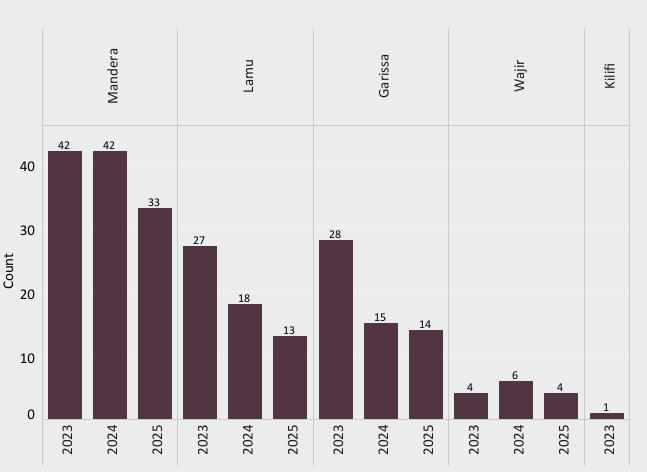 - Increase in intercommunal violence and livestock-related theft: Incidents of intercommunal violence and livestock theft increased from four in the previous period to six during the review period. Notably, clan-related violence was reported in Narok County between the Kipsigis and the Maasai over the disputed Angata Barikoi–Lolgororian boundary, resulting in at least seven fatalities.