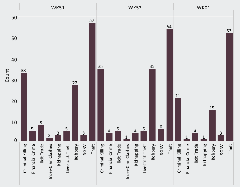 - High incidence of robberies and thefts: Robbery and theft accounted for the majority of criminal activity reported during the festive period. Business premises and residential properties remained the primary targets, collectively accounting for more than two-thirds of reported incidents. Gang-related activities were also reported during the period, contributing significantly to elevated crime levels in major urban centres.