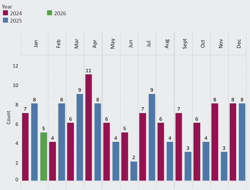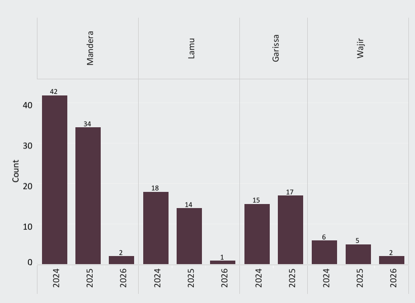 The reporting period was marked by a surge in militant activity along the Kenya–Somalia border, with December assessed as a high-risk month: indeed, eight attacks were reported in December compared to three in November. The wave of attacks that began in the second week of December persisted into the new year, with five incidents reported during the first week of January 2026. Security personnel, both police and military, including police reservists, remained the primary targets, with small-arms fire being the dominant modus operandi.